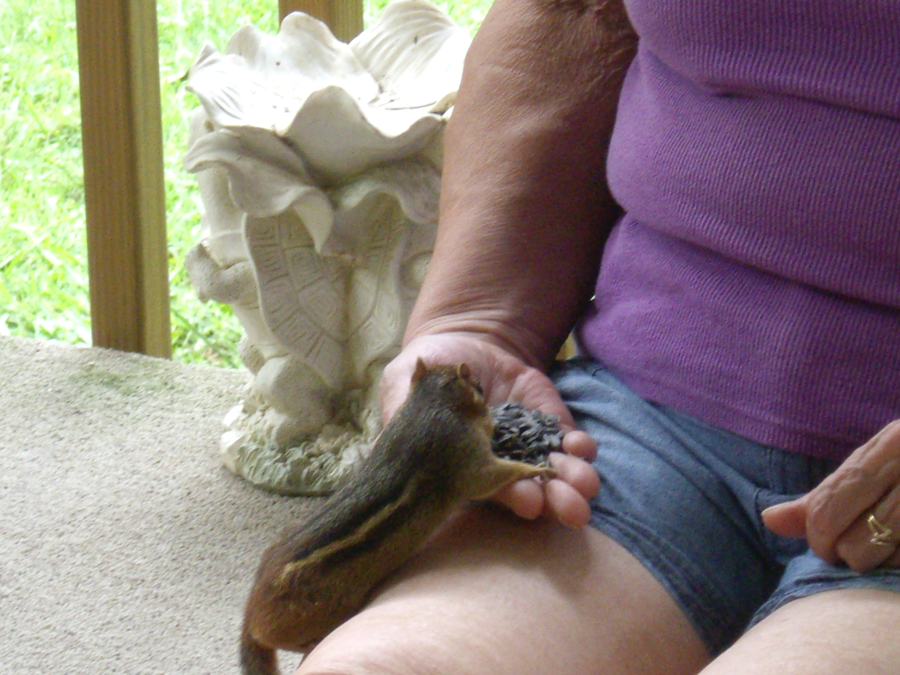 I love this little guy. He hears me come out the deck door and races up the steps and sits looking at me. “Hey lady, I’m here. Where’s my seeds?”